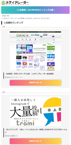 メディアレーダーは、広告・マーケティングに関する情報を会員にいち早く提供するため、最新の掲載資料や開催予定のセミナー案内などのメルマガを定期的に配信しています。