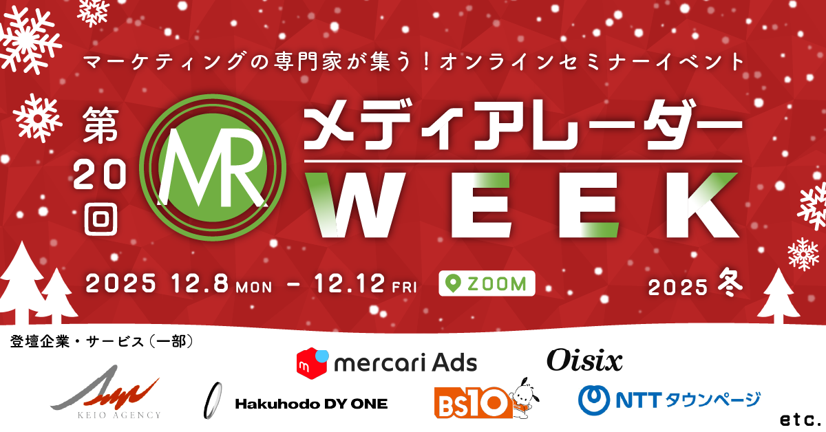 株式会社アイズ(所在地:東京都渋谷区、代表取締役社長:福島範幸、東証グロース:5242)が運営するNo.1*の広告業界のプラットフォーム「メディアレーダー」は、2025年12月8日(月)~12日(金)の5日間で、マーケティングセミナーイベント「第20回メディアレーダーWEEK 2025 冬」を開催します。