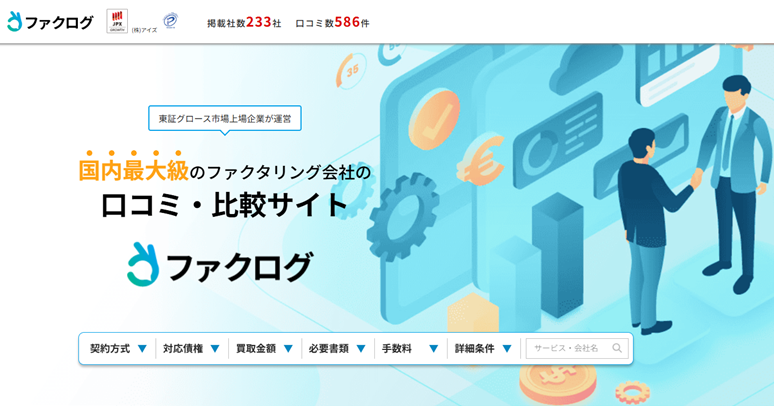 ファクログは、企業や個人事業主向けに、ファクタリング会社の情報を比較・検討できるプラットフォームです。複数のファクタリング会社を一覧で比較できるほか、手数料水準や入金スピード、対応債権などの条件をもとに、自社のニーズに合ったサービス選定を支援しています。