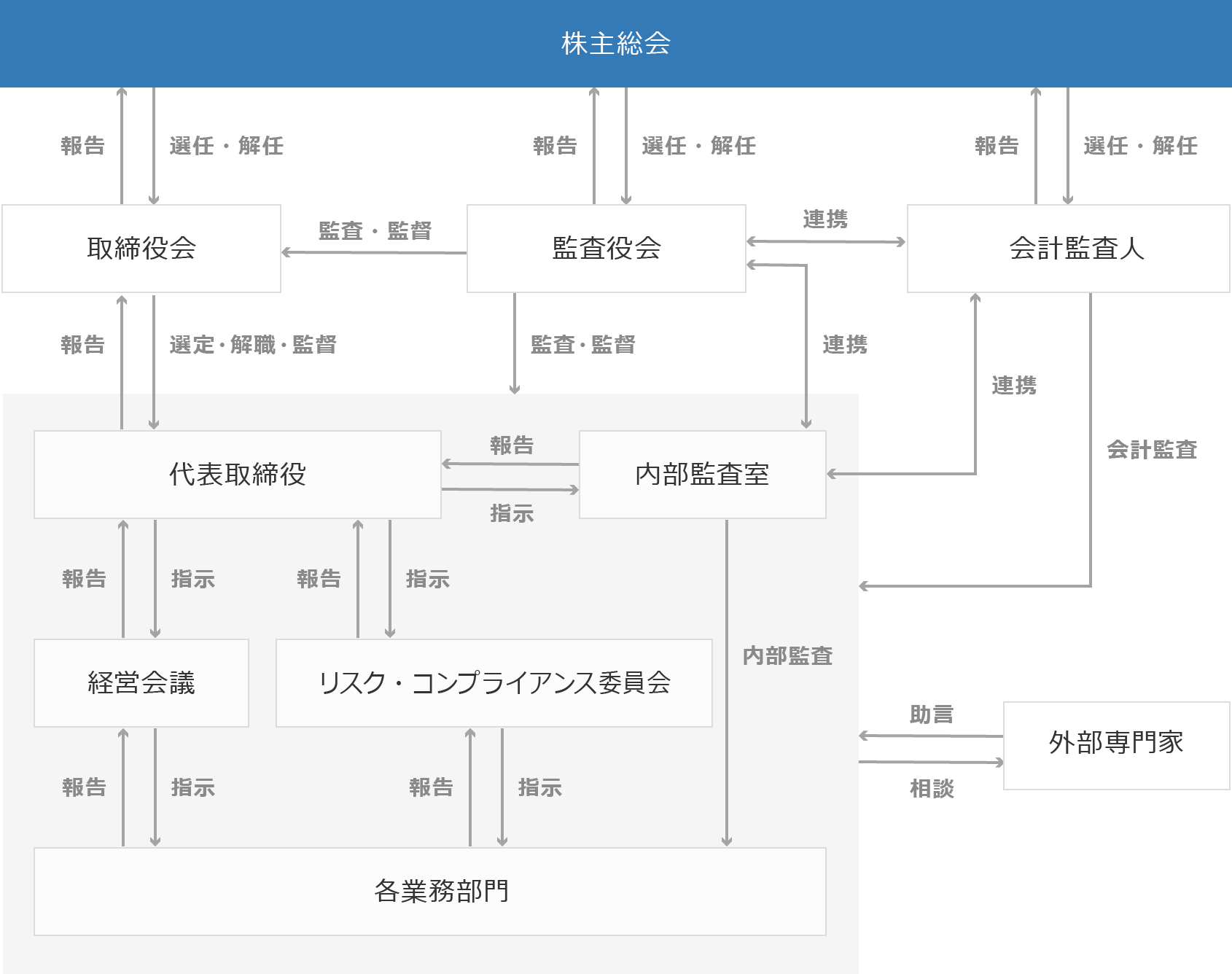 当社は、経営の効率化を図ると同時に、公正かつ透明性の高い経営を実践していくことにより、企業価値の継続的な向上を図り、当社のすべてのステークホルダー(利害関係者)からの高い信頼を得ることをコーポレート・ガバナンスの基本的な考え方としております。また、当社では「コンプライアンス」を社会に対する責任を果たすための大切な基礎として捉えており、その徹底が事業活動を継続していくうえで不可欠の要件であると認識し、コーポレート・ガバナンスの強化とともに、当社のコンプライアンス経営を積極的に推進しております。