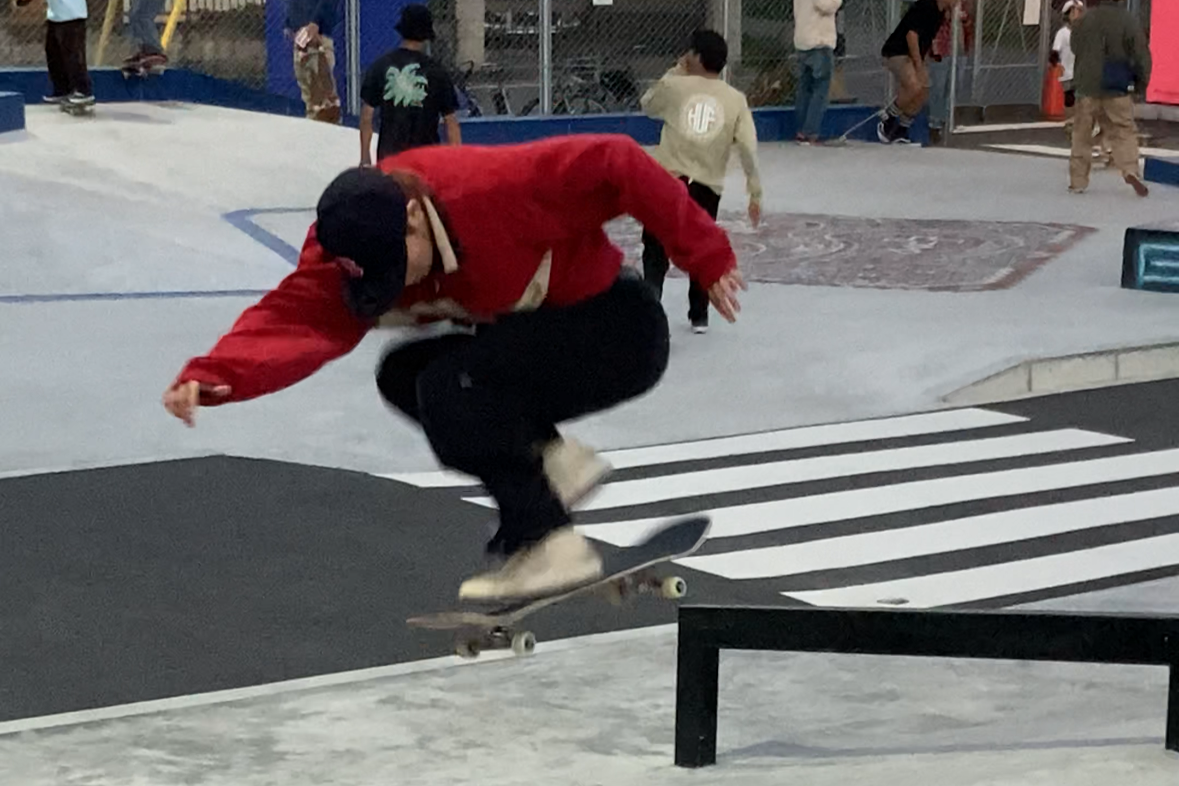 <スケートボードの技「ハードフリップ」をするkentoさん>